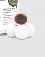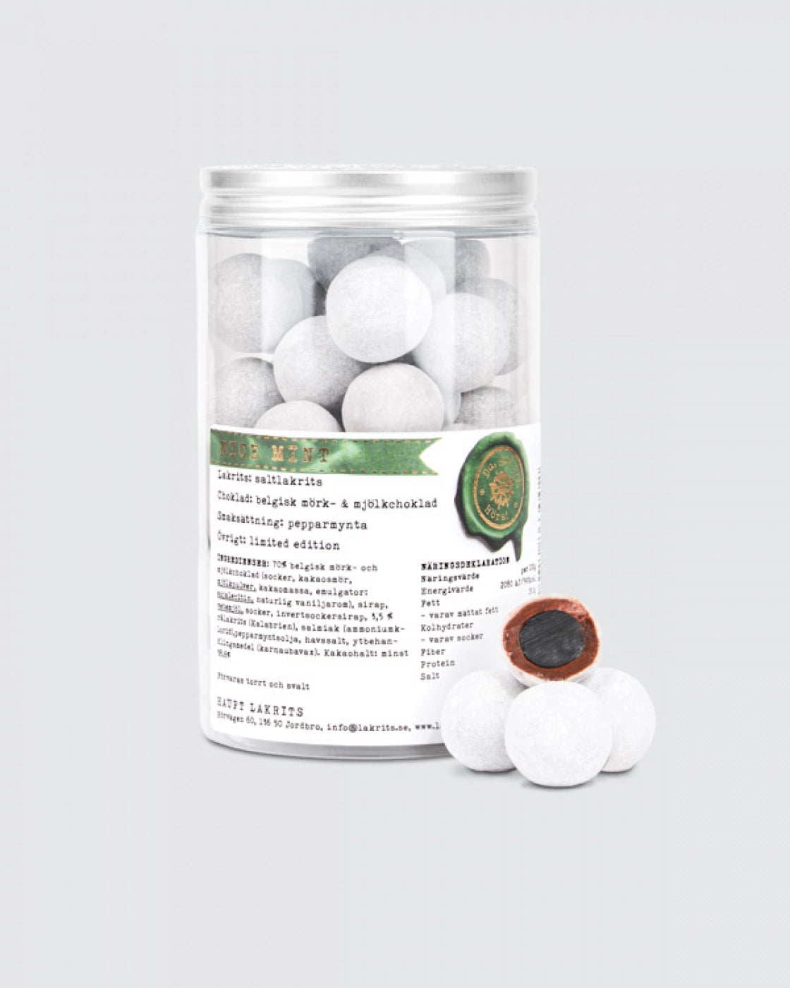 Långkokt saltlakrits, täckt av len belgisk choklad och förfinad med friskheten från äkta indisk pepparmynta.