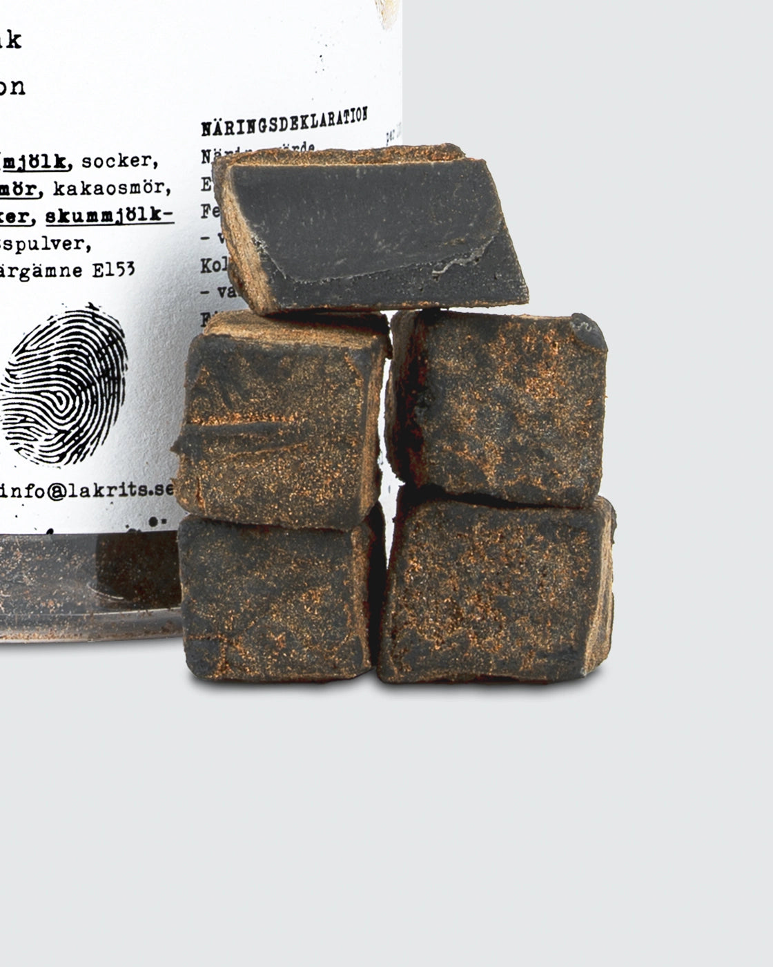 Innehåll: Socker, kondenserad mjölk (mjölk, socker, stabiliseringsmedel E509), glukossirap, smör, vegetabiliskt fett, kakaosmör, skummjölkpulver, salmiak, lakritspulver, emulgeringsmedel: sojalecitin.