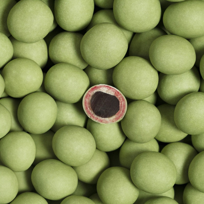 Föreställ dig läckra, nyplockade gröna jordgubbar tillsammans med seg, röd lakrits i en förförisk, fruktig munsbit - allt omslutet av silkeslen vit choklad och ett krispigt, grönt sockerskal som ger en extra syrlig twist.