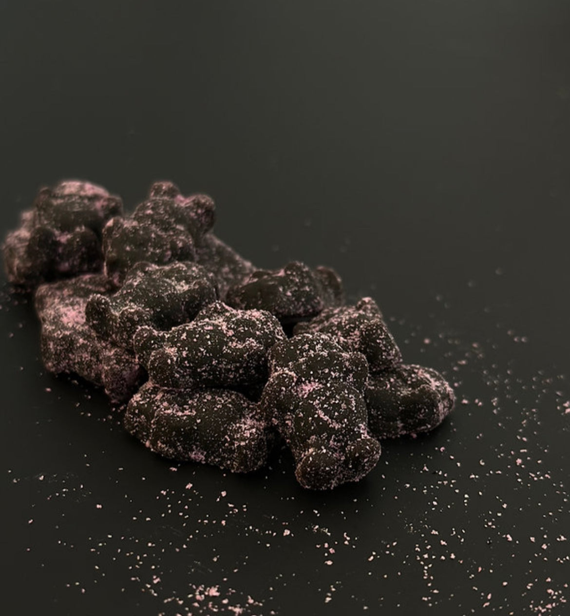 Innehåll: Socker, invertsockersirap, vatten, glukossirap, stärkelse, arom inklusive salmiak, lakrits, naturlig smak av jordgubb, citronsyra (E330), färgämne (E153, naturlig färg från rödbeta), ytbehandlingsmedel (kokosolja, E903). 150g